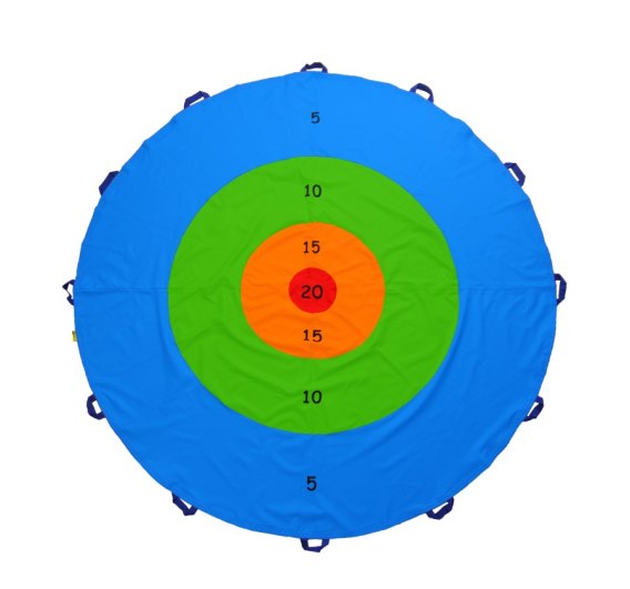 Chusta Tarcza to cztery barwne okręgi, każdy okrąg to inny kolor i inna punktacja (niebieski 5, zielony 10, pomarańczowy 15, czerwony 20).