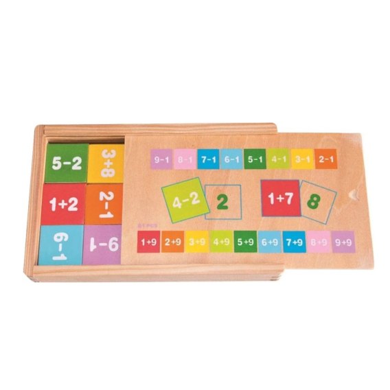 Doskonała pomoc edukacyjna, która w przyjazny i wesoły sposób pomoże dzieciom w nauce dodawania oraz odejmowania. Komplet zawiera aż 81 kolorowych dwustronnych płytek z równaniami oraz odpowiedziami. Całość zapakowana w estetyczne drewniane pudełko.