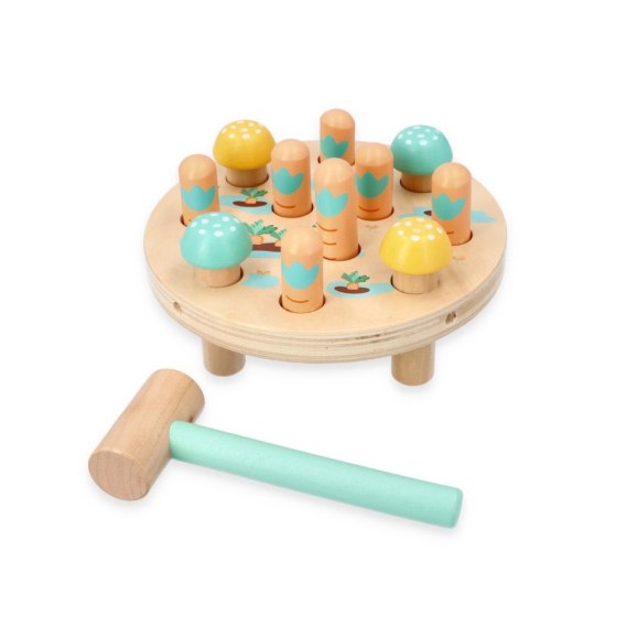 Okrągła drewniana podstawa jest ozdobiona uroczymi ilustracjami roślin i posiada otwory, w których należy umieścić kolorowe drewniane kołeczki w postaci marchewek. Zadaniem malucha jest zasadzenie marchewki poprzez wbicie jej młotkiem do środka. Zestaw zawiera przyjazny dla dziecka młotek z miętowym uchwytem, idealny do małych rączek. Gdy dzieci uderzają w marchewki, wbijając je do środka, rozwijają koordynację ręka-oko, umiejętności motoryki małej i zaczynają rozumieć związki przyczynowo-skutkowe. Po skończonej grze wystarczy odwrócić podstawę, wyjąć marchewki... i zacząć zabawę od nowa!