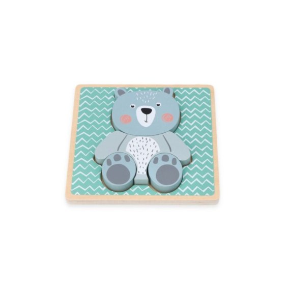 Ta drewniana układanka oferuje maluchom wspaniałą zabawę, trenując przy tym małe paluszki. Komplet składa się z podstawy oraz 4 puzzli. Doskonała propozycja dla najmłodszych dzieci, które dopiero zaczynają zabawę w dopasowywanie elementów. Pomoże w nauce o kształtach oraz częściach ciała.Te drewniane puzzle misia to nie tylko zabawka, ale cenne narzędzie we wczesnym rozwoju Twojego dziecka.