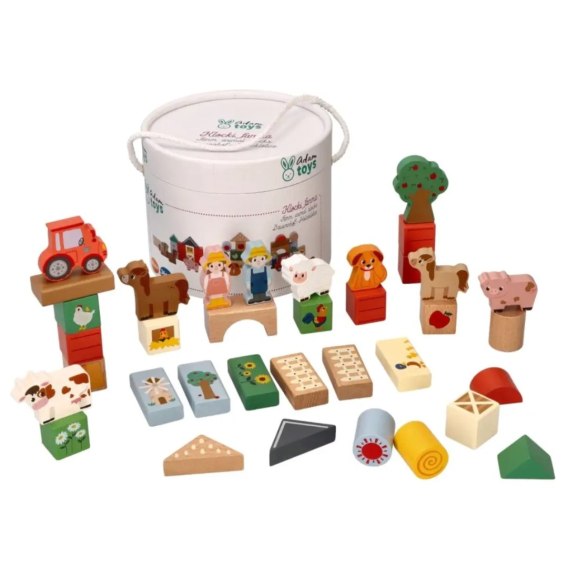 Drewniane klocki z motywem farmy uczą, bawią i dostarczają radości najmłodszym. Zestaw zawiera 35 pięknie wykonanych elementów. Duże figurki oraz różne wzory — wspierają dziecięca kreatywność i zachęcają do zabawy już od 1,5 roku życia.