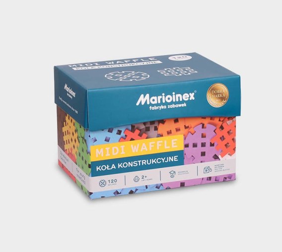 Seria klocków Midi Wafle to nieco większa odmiana klocków Mini Wafle. Zestaw Midi Koła Konstrukcyjne liczy aż 120 elementów w 10 kolorach. Jest to fantastyczny pomysł na urozmaicenie zabawy dziecku, ponieważ zestaw ten łączy się z każdym innym z serii klocki Midi Wafle. Klocki Marioinex, dzięki specjalnie zaprojektowanej formie łączą się ze sobą na różne sposoby dając nieograniczone możliwości konstrukcyjne. Całość zestawu została zapakowane w estetyczne, trwałe pudełko kartonowe, a oprócz tego w zestawie pojawił się także specjalny woreczek, przeznaczony do mycia klocków w zmywarce. Fantastyczna alternatywa na utrzymanie czystości w dziecięcych zabawkach.Zabawa i nauka to idealne połączenie, dzięki któremu maluch czerpie przyjemność z czerpania wiedzy i nabywania umiejętności. Te cechy łączą w sobie klocki - Midi Wafle. Zestaw składający się z 120 elementów to nieskończenie wiele możliwości tworzenia, jedynym ograniczeniem jest dziecięca wyobraźnia. Dziecko wiedzione wyobraźnią może stworzyć drzewa, budynki i wiele, wiele innych fantastycznych konstrukcji. Gdy zabraknie mu pomysłów, inspiracji dostarczy dołączona do klocków dla dzieci instrukcja. Ogromną zaletą klocków Midi Wafle jest jakość ich wykonania. Materiał jest miły w dotyku, lekko plastyczny i przede wszystkim bezpieczny. Ich zaletą jest także uniwersalność - te wyjątkowe klocki konstrukcyjne będą idealne, zarówno dla chłopca, jak i dziewczynki od 2 roku życia. Rozwiną wyobraźnię i wspomogą rozwój małych rączek!