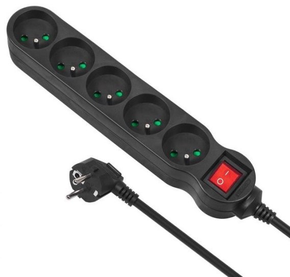Listwa zabezpieczająca z 5 gniazdami sieciowymi wyposażona w wyłącznik. Długość przewodu wynosi 3 m. Maksymalne obciążenie: 2300 W.