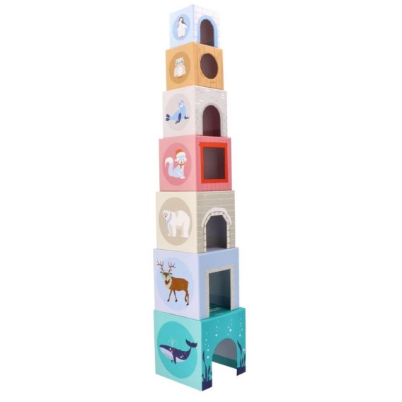 Zestaw składa się z 7 kubeczków różnej wielkości oraz 7 drewnianych klocków przedstawiających urocze arktyczne zwierzęta. Sympatyczna foka, ciekawska sowa śnieżna, majestatyczny wieloryb, wesoły pingwin i inne rozbrykane zwierzaki czekają i przebierają nóżkami z niecierpliwości, aby wspólnie pobawić się z Twoim brzdącem! A możliwości na zabawę jest wiele, gdyż dzieci mogą bawić się tak, jak tylko podpowie im wyobraźnia: