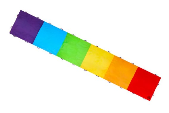 Mata obszyta jest tęczową taśmą wzmacniającą, wyposażona jest w aż 28 wzmacnianych uchwytów, które poszerzają wachlarz animacji i zabaw, możemy matę rozłożyć na ziemi bądź trzymać w powietrzu.