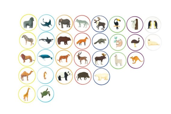 - kolorystyka: kolorowy nadruk zwierząt na białym tle